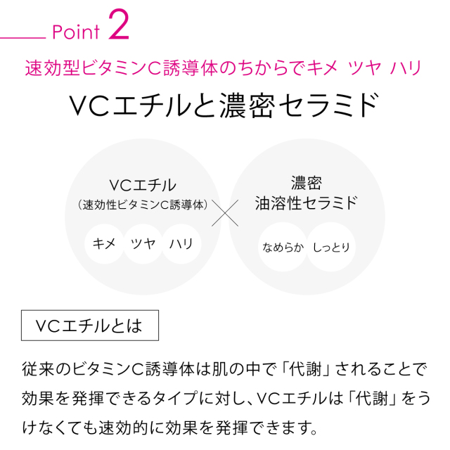誰もが憧れる美肌はセラミドとビタミンc誘導体の力を借りることでかなえられます! セラミドを効率的にお肌に補給することによって、 ・ハリと潤いの保持 ・シワやたるみの防止 そしてビタミンc誘導体によって、 ・美白 ・アンチエイジング ・毛穴ケア.